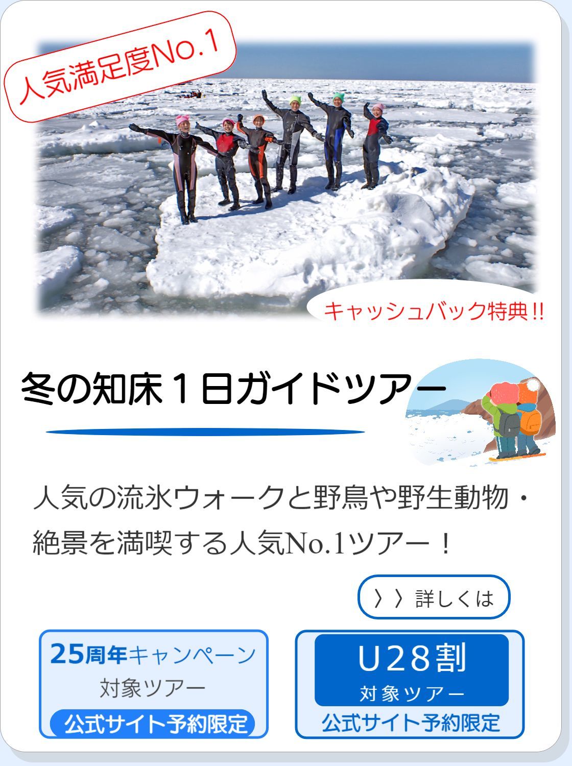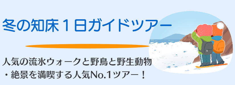 | 2025.10.19 | 冬シーズンのプログラムは現在修正中です(火曜の流氷ウォーク・木~月の流氷ウォーク&スノーシューの1日ツアー・1月の知床五湖ツアー)。予約受付開始は12月下旬頃を予定しております。お待たせして申し訳ございません。 |