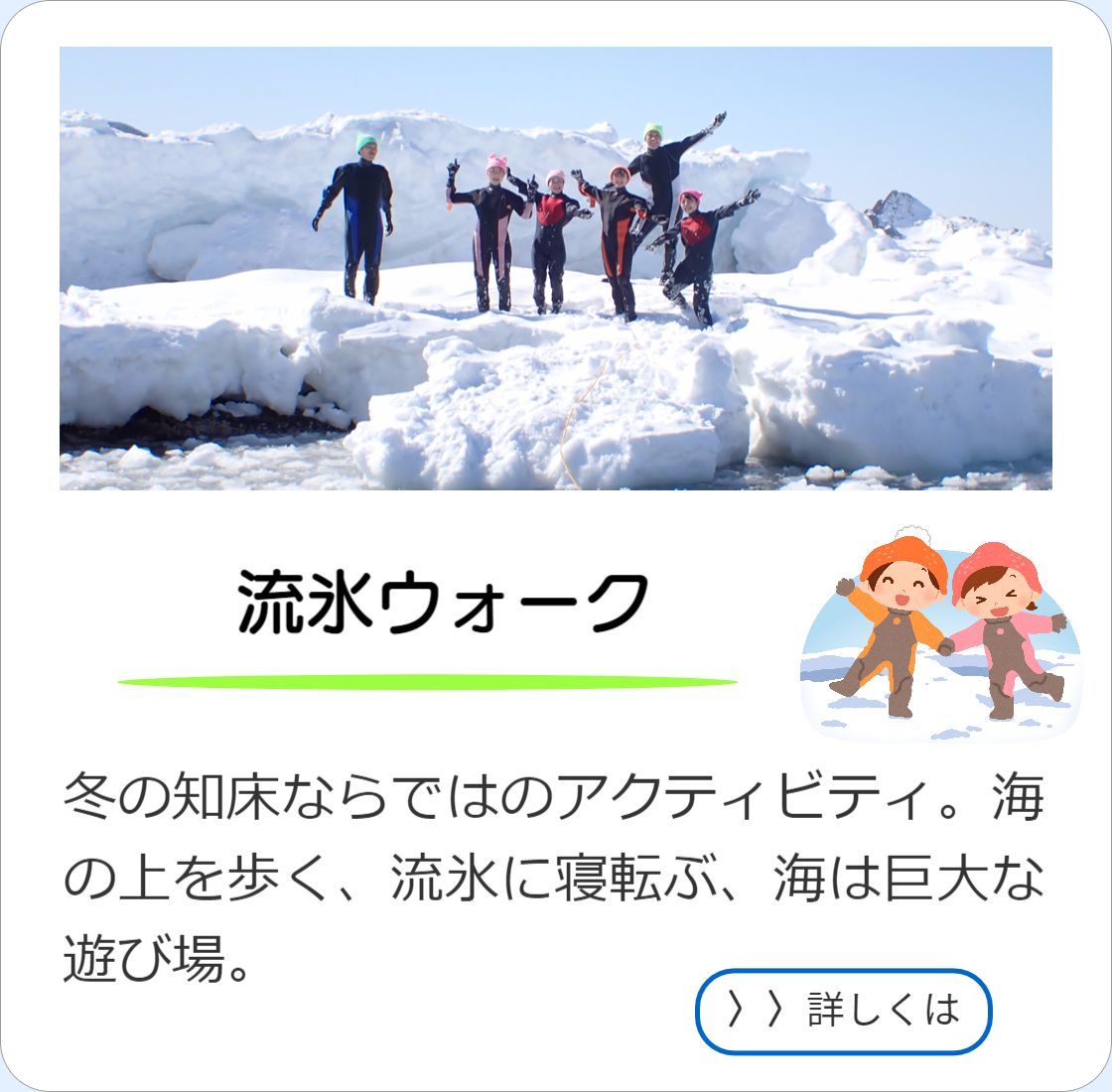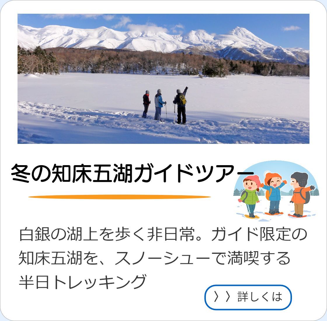 2025.10.19 | 冬シーズンのプログラムは現在修正中です(火曜の流氷ウォーク・木~月の流氷ウォーク&スノーシューの1日ツアー・1月の知床五湖ツアー)。予約受付開始は12月下旬頃を予定しております。お待たせして申し訳ございません。 |