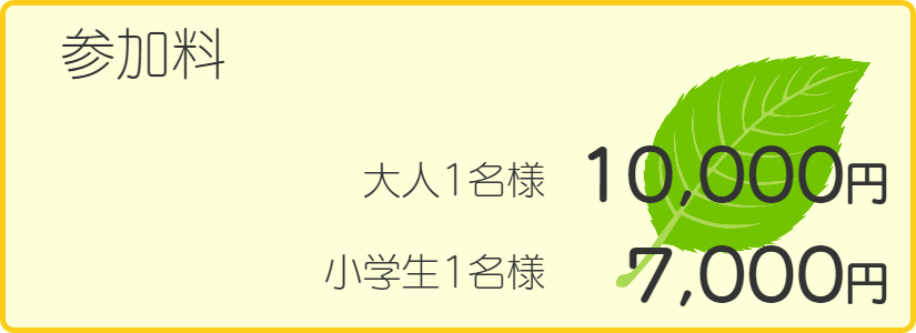 ・長袖長ズボン (8~9月 スズメバチ予防の為淡い色の服装がおすすめです。) ・運動靴やスニーカー (ぬかるみや雨天時は長靴の無料レンタルがあります。) ・あれば帽子 (スズメバチ予防の為淡い色がおすすめです。) ・あればレインウェア (無料レンタルがあります。) |